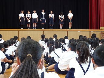 児童会で運営する代表委員会と6つの委員会(情報・図書・健康・運動・環境・集会)の代表が舞台の上で、原稿を見ずにしっかりとそれぞれの活動内容を発表しました。