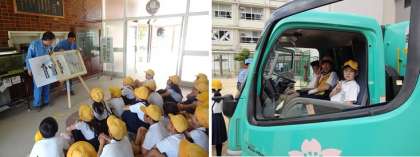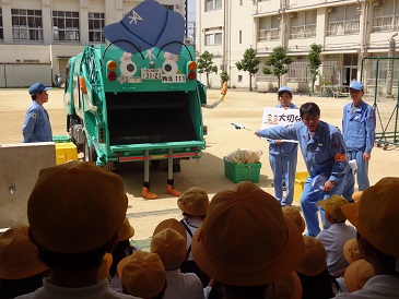 5月17日(金)大阪市西北環境事業センターの職員の方に来ていただき、4年生がごみについての学習をしました。パッカー車のしくみやごみに関するクイズ、ごみを減らすための3Rの工夫などいろいろ楽しく学びました。
