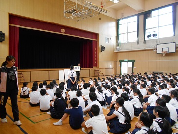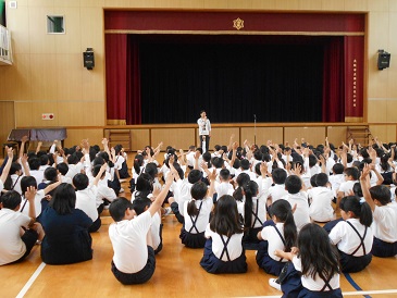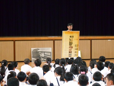 朝会では「創立」という字を見せて、その意味と学校が86歳になったことを話しました。そして、創立当時の正門や校舎の写真を見せました。伝統ある海老江東小学校がこれからも素晴らしい学校であるためにみんないろいろなことに頑張ってほしいと言いました。