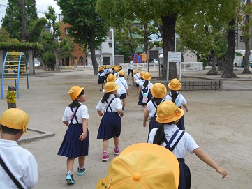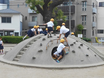 5月20日(月)1年生が海老江上公園に公園たんけんに出かけました。公園には緑がいっぱいあり、気持ちがよかったです。また、たくさんの遊具がありました。みんな、公園で遊ぶときのルールを守って、楽しく仲良く遊ぶことができました。