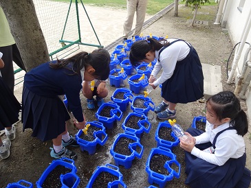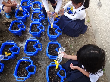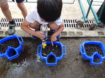 5月21日(火)1年生がアサガオの水やりをしていました。