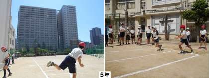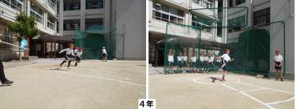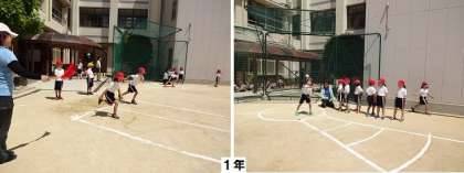 4年生、5年生、1年生の順に、ソフトボール投げと50m走を測定しました。