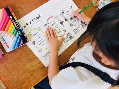 給食に出てくるいろいろな食べ物の名前を覚えながら、それぞれどんな栄養があり、自分たちの健康のためになっているのかを色分けをしながら学びました。