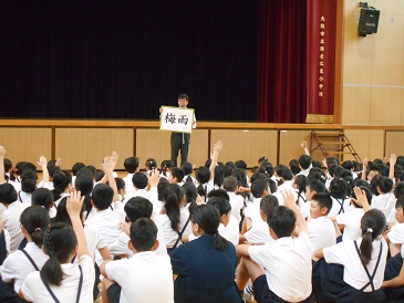 つぎに、梅雨の意味を天気図を示しながら説明しました。また、どうして「梅」という字を使うのかということを説明するのに玄関の梅の木の実を見せながら梅が熟すころに降る雨なのでそう書かれることを言いました。