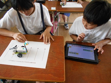 つぎに、二人一組でタブレットパソコンでソフトを使い、前に進む・止まる・後退するなどの指示のアイコンを組み合わせ、ロボットの動きをプログラミングしていきます。