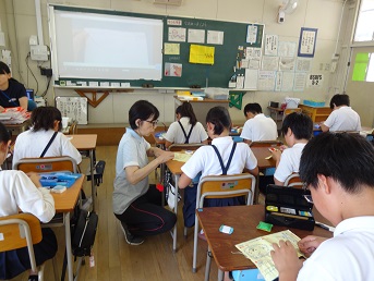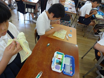 6月11日(火)5年生が家庭科の「はじめてのソーイング」で、なみ縫いに取り組んでいました。縫い方の基本となるなみ縫いですが、まだまだ緊張しながら、一生懸命針と糸を運んでいました。玉結びと玉止めもがんばれ!