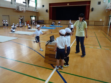 6月12日(水)1年生が体育科の「マットあそび」の学習を体育館でしていました。