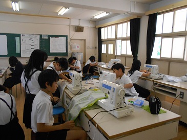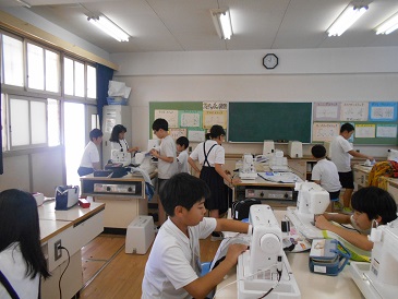 6月13日(木)6年生が家庭科の学習「楽しくソーイング」でエプロン作りをしていました。