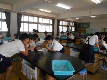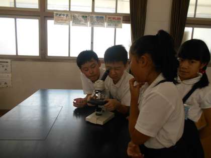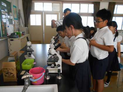 6月13日(木)5年生が、理科で初めて顕微鏡を使って学習していました。顕微鏡の正しい使い方を教えてもらったあと、花粉や採取した池の水をプレパラートに載せて、観察しました。顕微鏡をのぞくと、想像以上に大きく拡大された対象物に驚きの声があがりました。「おおー!」「何か動いている」熱心に観察していました。