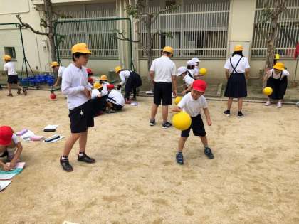 2・3時間目の間の15分の休み時間と昼休みには、体力ビンゴが始まりました。運動場4種目、体育館4種目に分かれて、2人か3人組で友達に見てもらいながら交代で記録を取っていきます。15分の休み時間は、1年と6年、2年と4年、3年と5年がペアになって活動します。