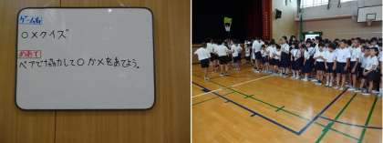 スマイル班の中で異学年の児童が組になり、集会委員会の児童が出すクイズに○か☓かを考え、その場所に移動して答えました。