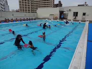 1・2年生の水あそびでは、水に対する抵抗感も少しずつ減り、顔をつけたり、浮いたりするのもだんだん慣れてきている子も多いようです。ビート板をもって、バタ足の練習もしていました。