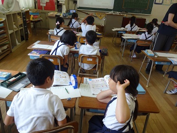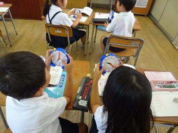 7月16日(火)1年生が算数科の時間に「なんじ、なんじはん」の学習をしていました。