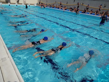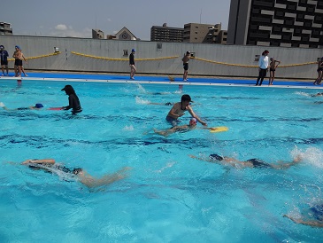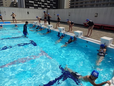 クロールでのきれいな泳ぎ方や平泳ぎのキックの仕方をバディを組んで教え合いながら学習していました。