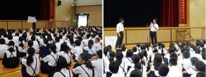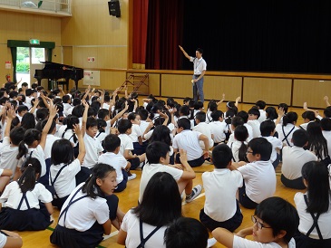 今年度の目標をもとに1学期の振り返りをしました。自分や人への優しさ、やる気を持った学習については、「とても頑張った」(30%)「まあ頑張った」(60%)「頑張りが足りなかった」(10%)ぐらいで、運動や健康への積極性については、「とても頑張った」(50%)「まあ頑張った」(40%)「頑張りが足りなかった」(10%)ぐらいでした。37日間の夏休みには1学期の課題を反省し、普段できない新しいことにも挑戦してほしいと話しました。また、C-NETのMr.Aからも外国の人に出会った時の簡単なあいさつを教えてもらいました。
