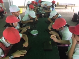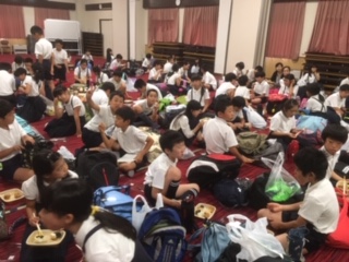 大広間でお弁当を食べた後、予定を変更して宿舎のテントの中で、焼き板工作をしました。