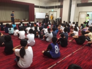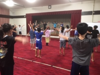 雨が降ったり止んだりして、朝の集いは大広間で行いました。今日の活動のお話を聞いたり、ラジオ体操をしたりしました。