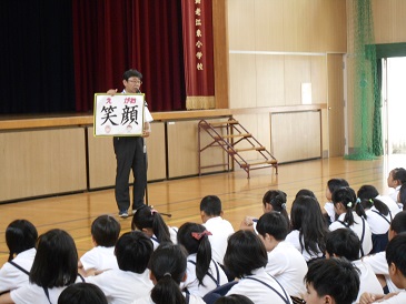 そこで、今朝の漢字は「笑顔」にしました。笑顔の効果についていくつか話をしました。