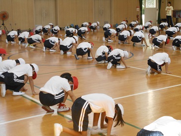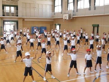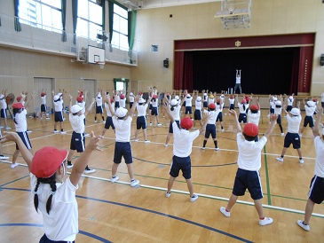 運動会の団体演技の練習を1・2年生が体育館でしていました。