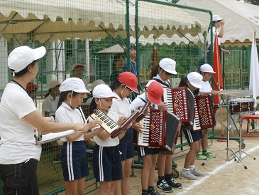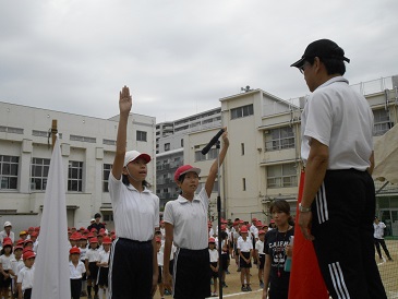 総合練習の開会式の中では、音楽クラブによる校歌の伴奏や、児童代表による誓いの言葉、全校児童による準備運動(ラジオ体操)の練習などを行いました。