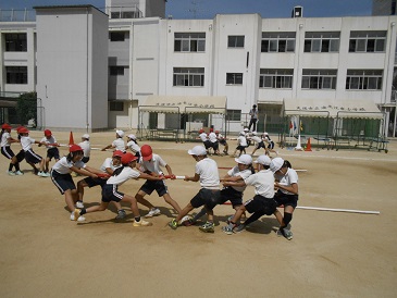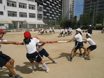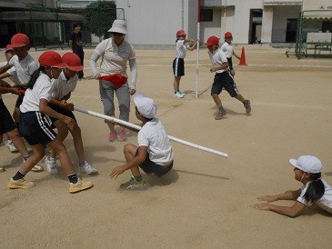 9月20日(金)4年生が運動会でする団体競技「棒引き」の練習をしていました。
