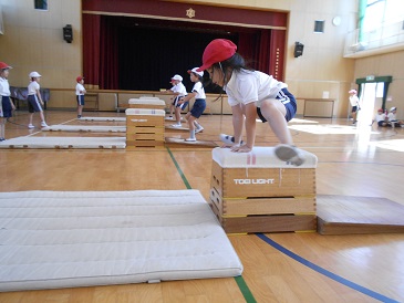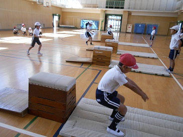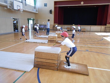 踏み切り方や手のつき方、跳び越しの姿勢、着地の仕方など頑張っていました。