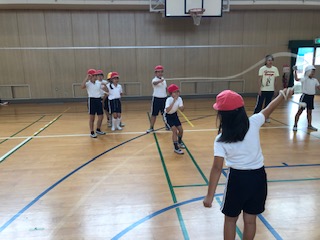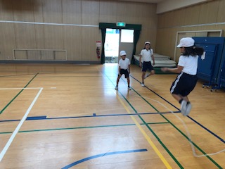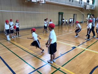 タイミングよく、縄の中に入って跳ぶことはなかなか難しいですが、みんな一生懸命、声を掛け合って頑張っていました。縄を回すのも跳びやすく上手にできていました。