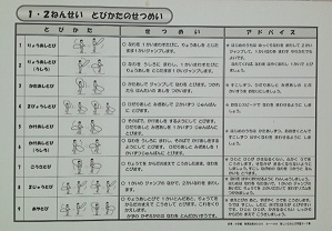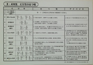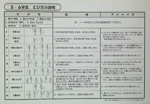 なお、この「なわとびのとびかた説明板」は大阪府教育センターが子どもたちの体力向上のために出している大阪なわとび級判定『チャレンジおおさかなわとびカード』から取り出して拡大したものです。