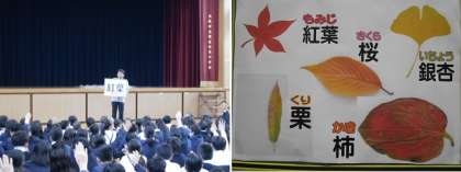 その後、紅葉している木の葉の写真を見せ、何という木かたずね、漢字も示しました。今週28日から作品展が開かれるので、紅葉のようにいろいろな色や形にも興味をもって人の作品を鑑賞してほしいと話しました。