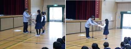 続いて、大阪府学生科学賞で優秀な研究作品を出した児童と消防図画作品の表彰された児童に賞状を贈呈しました。