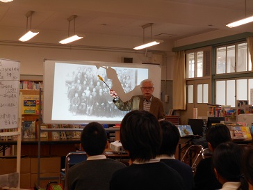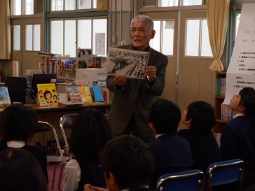 日本が太平洋戦争へ進んでいった様子や、戦時中の海老江地域の様子、当時の生活の様子などをスライドや写真を交えながら、体験者からお話をしていただきました。貴重な話を聞けて、子ども達もよかったと思います。ありがとうございました。