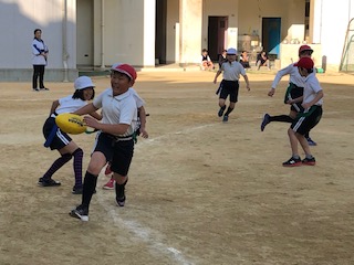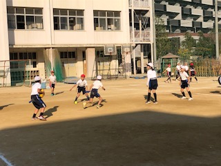 4年生が体育で「フラッグフットボール」に取り組んでいます。ルールを覚え、パス練習を経て、対抗試合をしています。プレイするだけでなく、審判も自分たちでしています。安全に気を付けて、楽しく一生懸命ゲームをしています。