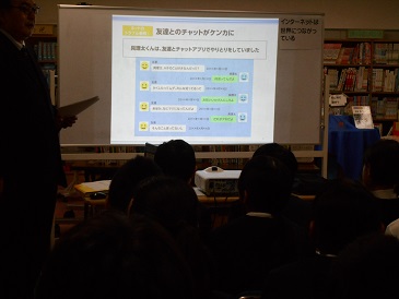 次に、インターネットの世界への注意喚起で、パソコンやスマホに関わる犯罪の事例を挙げながら、加害・被害に巻き込まれない使い方の留意点を話していただきました。子ども達は真剣に聞いていました。