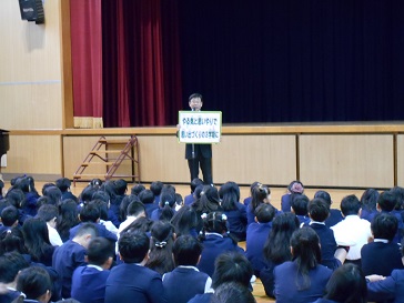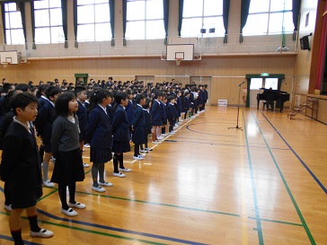 生活指導の先生から、ルールや約束を守って一日一日を大切に過ごすようにお話がありました。最後に、校歌を歌って締めくくりました。