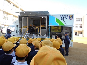 次に、体験活動として4・5・6年生は起震車に乗って、地震の揺れ(震度7)を体験しました。