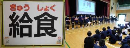 給食調理員さんの紹介や調理の仕方、調理器具、調理機械などについてクイズを交えながら全校の子ども達と楽しく活動できました。