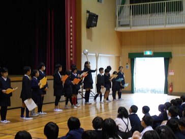 1月20日(月)今日の朝会は今週行われる「給食週間」にちなんで、健康委員会の子ども達による給食に関する発表を中心に行いました。