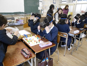 まず、建設業の仕事について簡単に学んだあと、ビルディングが建つ様子をVR(バーチャルリアリティ)で体験しました。