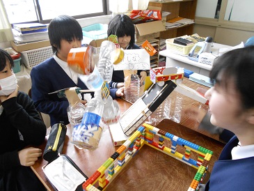 その後、私たちの街のシンボルとなる建物とメインスタジアムを菓子箱やペットボトルで制作し、組み立てる活動をしました。