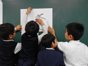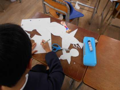 1月29日(水)2年生が図画工作科「たのしくうつして」の学習で、紙版画に取り組んでいました。画用紙に鳥や人の絵を描き、はねや目なども切って、重ね貼りしていました。次回はインクをつけて版画にするようです。楽しみです。