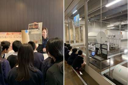 2月17日(月)5年生が凸版印刷工場(朝日新聞大阪工場)に社会見学に行きました。はじめに新聞のできあがるまでのDVDを見て、その後見学デッキから巨大な輪転機が動き出すところを目の前で見ることができました。活字や写真が印刷される前の、重さ1.3トンもあるロール紙を運ぶための自動運転ロボットや、ロール紙を400本も格納できる立体紙庫の見学もできました。新聞の印刷工場の仕組みや働く人たちの様子などを勉強することができました。普段なかなか見れない印刷工場が校区内にあることは大変恵まれています。