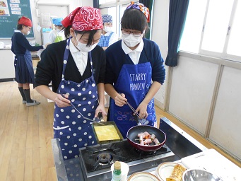 2月20日(木)は6年1組、21日(金)は6年2組が小学校生活最後の調理実習をしました。メニューは、お弁当のおかず作りでした。内容はウインナー、野菜のベーコン巻き、卵焼き、プチトマト、ブロッコリーです。さすが6年生です。段取りよく、落ちついて調理を進めていました。できあがったおかずを、家から持ってきたお弁当箱に彩りよく詰めていました。最後に、給食のおかずの一部とごはんを入れて完成です。みんなおいしそうに食べていました。