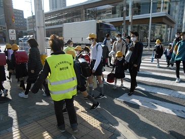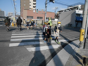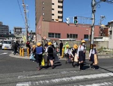 海老江交差点の歩道橋が撤去されて初めての登校でもあり、見守り隊やPTAの方も立って、安全を確認していただきました。
