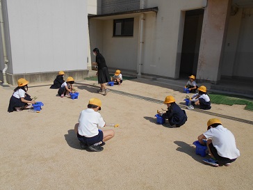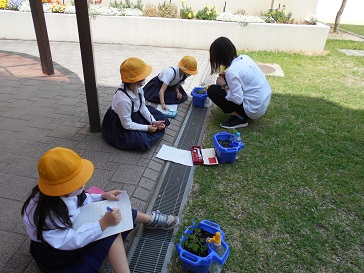 苗を上手に鉢に植えた後は、水やりをしてから、その様子を紙に描いていました。