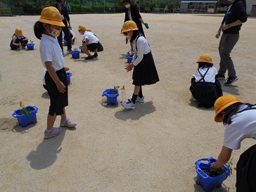 5月13日(水)2年生は早速ミニトマトの苗を鉢に植え替えました。