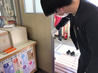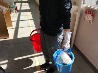 教職員は教室や扉、手すりなど、全員がさわったり触れたりする場所を毎日、消毒しています。数多くの場所を消毒液を使いながら、ていねいに除菌やふき取りをしています。臨時休校中ですが、いつ授業が始まっても大丈夫であるように、子どもたちのことを考えながら教職員もがんばっています。