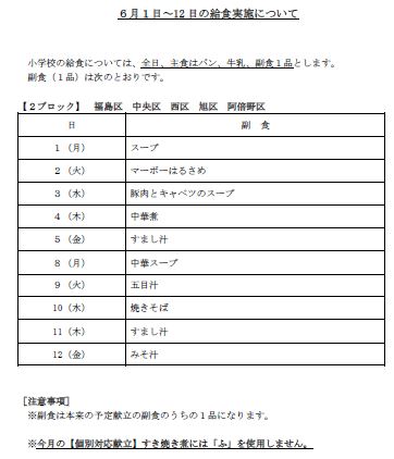 ※食物アレルギー個別対応用献立表の6月1日〜12日分(修正分)は、大阪市教育委員会から5月27日(水)に配信される予定です。該当する児童については、記入表を29日(金)の登校日にお渡しする予定です。