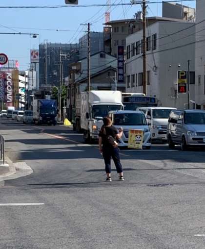 2.横断するときは、子ども達と少し一緒に歩いて、横断歩道の途中で安全を確保。車からよく見えるように、おそろいの黄色い旗を持って見守りです。
