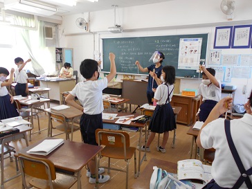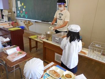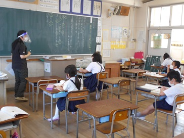 6月2日(火)授業中や給食中などには、教職員が飛沫感染防止の観点で配付されたフェイスシールドを適宜着用しています。