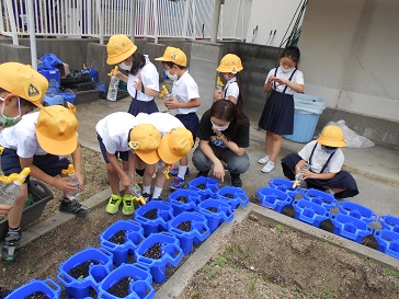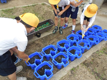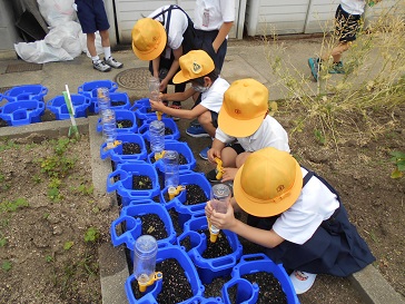 6月3日(水)1年生がアサガオの水やりをしていました。
